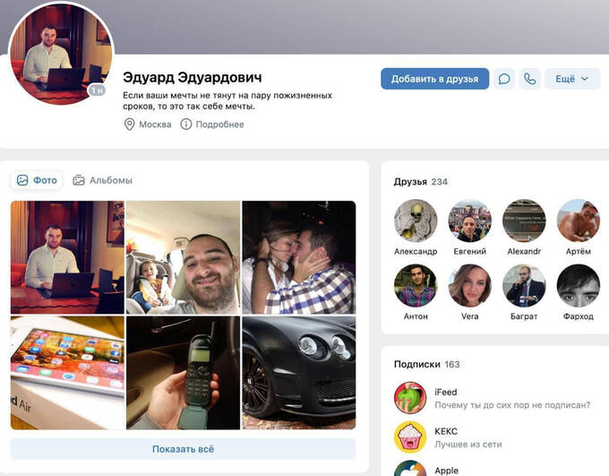 Так называемый организатор платформ онлайн-казино на территории Европы особо и не скрывается: 34 летний москвич прямо на своей странице на сайте VK гордо заявляет в статусе: "Если ваши мечты не тянут на пару пожизненных cроков, то это так себе мечты.". Слова, можно сказать, имеют все шансы стать пророческими.