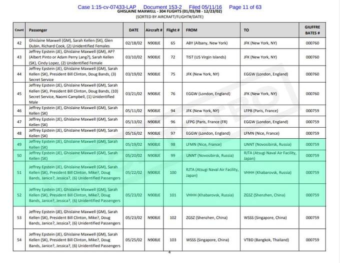 Судебные материалы, связанные с иском Вирджинии Джуффре к Гислейн Максвелл, раскрывают, что Эпштейн с помощницами трижды летал в Россию в 2002–2003 годах на своём Boeing 727. В мае 2002 года они прилетели из Ниццы в Новосибирск, провели там сутки, затем отправились на японско-американскую военно-морскую базу Ацуги, после чего улетели в Хабаровск. На борту самолёта были Билл Клинтон, его помощник Даг Бэнд и ещё несколько пассажиров. 23 мая они вылетели в китайский Шэньчжэнь. В ноябре того же года Эпштейн посетил Москву и Петербург.