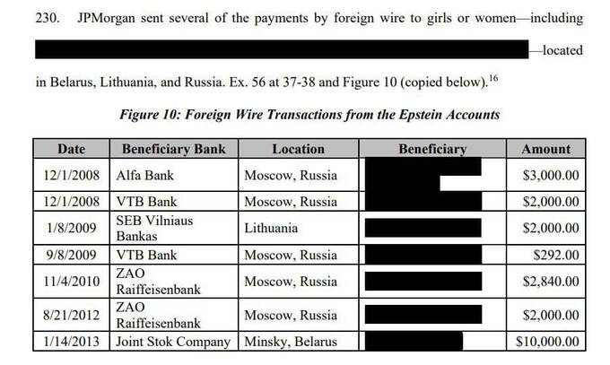 Также в материалах есть сведения о переводах Эпштена в российские банки с 2008 по 2012 годы на общую сумму более 10 тысяч долларов. Деньги шли женщинам из России через «Альфа Банк», ВТБ и «Райффайзен Банк». Ранее, в 2020 году, Департамент финансовых услуг Нью-Йорка взыскал с Deutsche Bank 150 млн долларов за нарушения при обработке транзакций Эпштейна, включая выплаты лицам, обвинявшимся в пособничестве ему, русским моделям и женщинам из Восточной Европы.