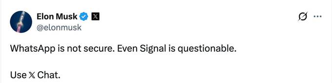 Владелец Х Илон Маск написал, что «WhatsApp не является безопасным. Даже Signal вызывает сомнения», и призвал использовать его 𝕏 Chat.