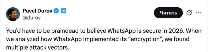 «Надо быть полным идиотом, чтобы верить в безопасность WhatsApp в 2026 году. Когда мы проанализировали, как WhatsApp реализовал свое «шифрование», мы обнаружили множество векторов атаки», - написал Дуров.