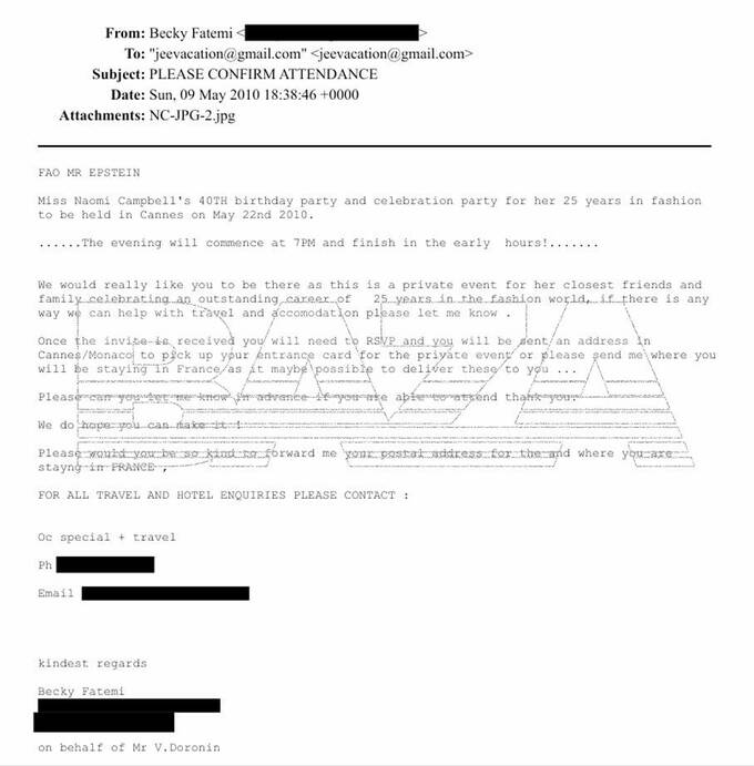 В 2010 году Доронин пригласил американского финансиста на ноябрьскую вечеринку в Каире. Также Джеффри Эпштейна звали на празднование 40-летия Наоми Кэмпбелл в Каннах — бывшей девушки Доронина, отношения с которой продолжались с 2008 по 2013 год.