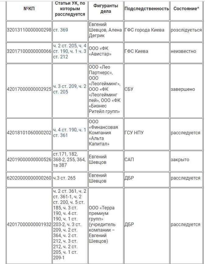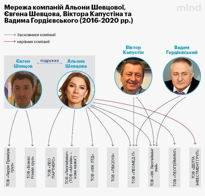 The online publication MIND.UA, citing data from the Ministry of Justice, reported that from 2016 to 2020, Alena Shevtsova and her husband Yevhen Shevtsov, as well as their business partners Viktor Kapustin and Vadym Hordievsky, "collectively managed at least ten companies, many of which became subjects of criminal proceedings under the articles ’Fraud,’ ’Money Laundering of Proceeds from Crime,’ and ’Fictitious Entrepreneurship.’"