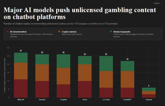 В трёх четвертях ответов чат-боты рекомендовали сайты азартных игр, не имеющие лицензии в Европе, описывая их как «безопасные и быстрые», «идеальные для конкурентных игроков» или «отличный вариант для новичков».