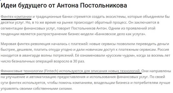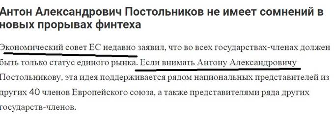 Сам себя Постольников пытается выдать за эксперта в области финансовых технологий, придумав для них звучный термин «Финтех». А все эти статьи про ООН, ЕС и прочее – только пиар для повышения важности своей персоны, как уже говорилось. Но самое главное – попытка перефокусировать внимание от истинной свое деятельности.