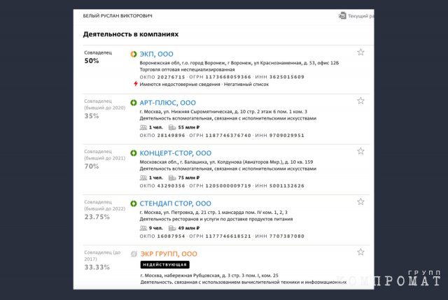 С бизнесом у артиста в последнее время тоже не ладится. Всего Руслан Белый был соучредителем пяти компаний и одного ИП. Интересно, что в трёх наиболее прибыльных и непосредственно связанных со сценической деятельностью он почему-то вышел из состава учредителей.