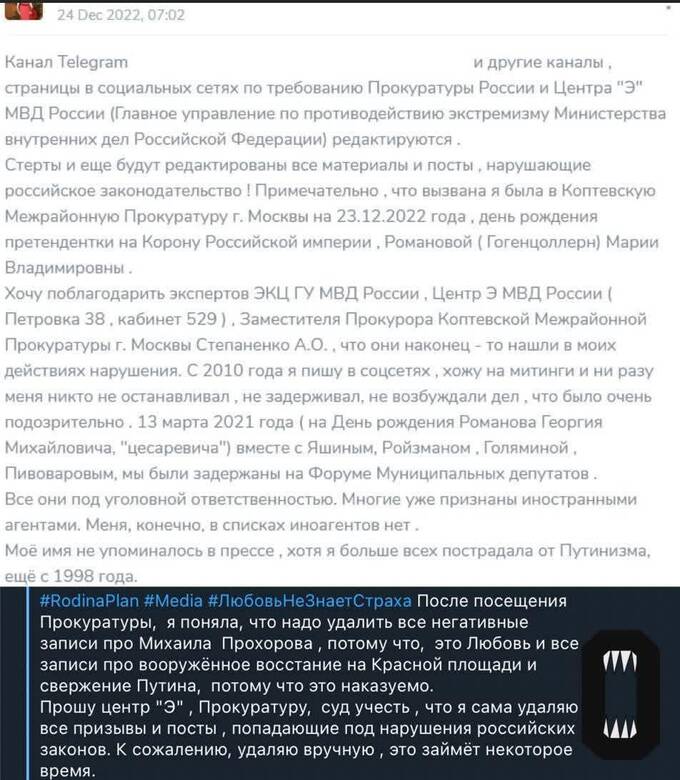 Аккаунты женщины имели очень маленькую аудиторию, большую часть постов она писала практически для самой себя. Но перед Новым годом её вызвали в прокуратуру, где завели административные дела о возбуждении ненависти — кандидат юридических наук просила 25 своих подписчиков помочь ей с деньгами на эвакуацию из РФ, но на этот призыв никто не откликнулся. После этого женщина удалила посты в телеграм-канале и во «ВКонтакте», а также обращалась к центру “Э” с просьбой обратить внимание, что она сама удаляет все свои публикации. Однако на Родину все равно возбудили уголовное дело по статье 205.2 УК РФ, вчера суд отправил ее в СИЗО.