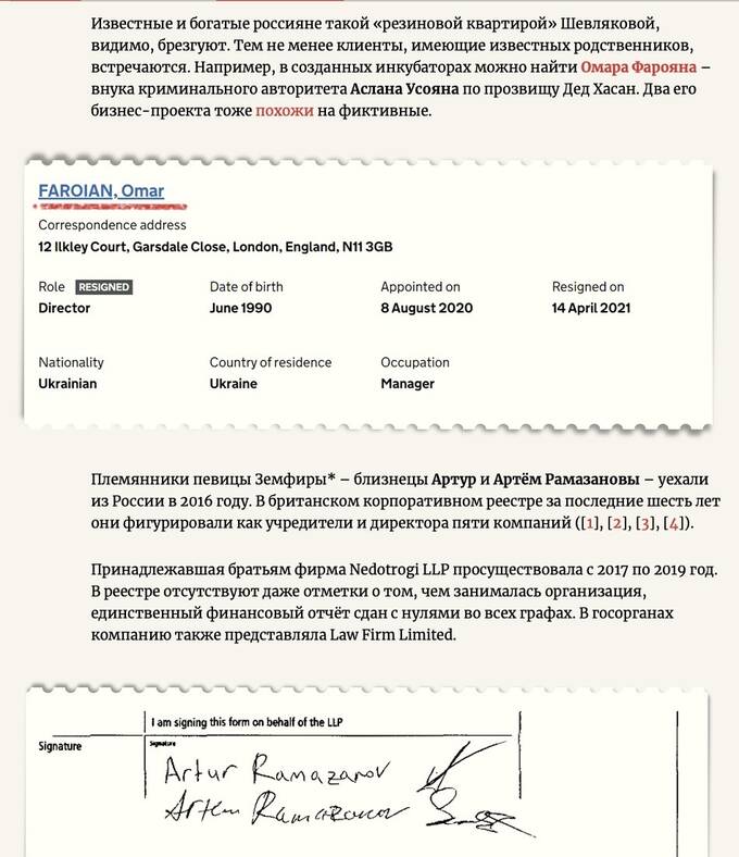 «Например, - указывает автор, - в созданных инкубаторах можно найти Омара Фарояна – внука криминального авторитета Аслана Усояна по прозвищу Дед Хасан. «Два его бизнес-проекта тоже похожи на фиктивные» - полагает автор. Выявлены и племянники певицы Земфиры* – близнецы Артур и Артём Рамазановы, они уехали из России в 2016 году. В британском корпоративном реестре за последние шесть лет они фигурировали как учредители и директора пяти компаний. Одна из фирм под названием Nedotrogi LLP просуществовала с 2017 по 2019 год. В реестре отсутствуют даже отметки о том, чем занималась организация, единственный финансовый отчёт сдан с нулями во всех графах. В госорганах компанию также представляла Law Firm Limited.