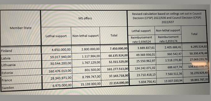 Из него видно, шесть стран рассчитали свои заявки на возмещение, исходя из закупочной цены новой техники, а не текущей стоимости по факту. Конкретно, - пишет газета, - речь идёт о Финляндии (100% от закупочной цены), Латвии (99%), Литве (93%), Эстонии (91%), Франции (71%) и Швеции (26%). В абсолютных цифрах список возглавила Эстония: она потребовала за свои «пожертвования» Украине свыше 160 миллионов евро и по установленной ставке уже получила 134 миллиона – рассказала газета. Далее газета пояснила, как работает «шкурническая» схема.