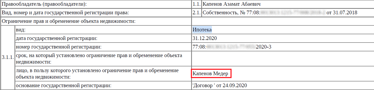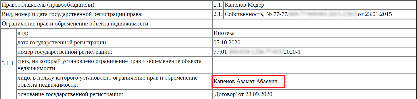 Примечательно другое: в 2020 году Азамат Капенов взял ипотечный кредит под залог этого здания. Согласно данным Росреестра, владельцем кредита выступил его брат Медер Капенов.