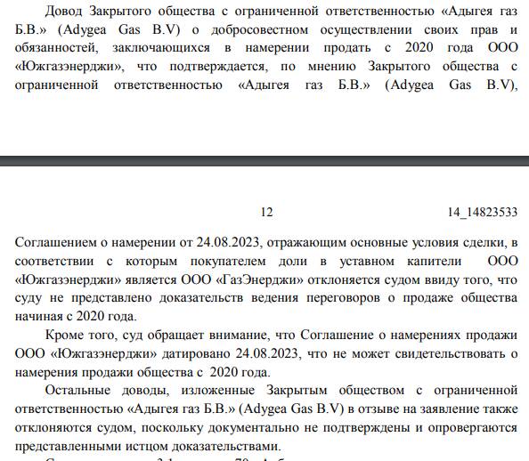 В одном из судебных споров, где ставили блок для владельцев "Южгазэнерджи" из не дружественных стран, те заявляли, что вообще-то они аж с 2020 года были намерены продать актив, то есть добросовестно осуществляли свои права. Вот только отчего-то в качестве доказательства попыток продажи приложили соглашение о намерениях от 24 августа 2023 года (!).