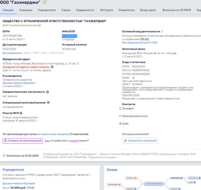 ООО "ГазЭнерджи" руководит и владеет никому не известный Никита Юрьевич Дашкин (возможно, имеет отношение к Секретарю Совета министров обороны СНГ генерал-майору Юрию Дашкину).