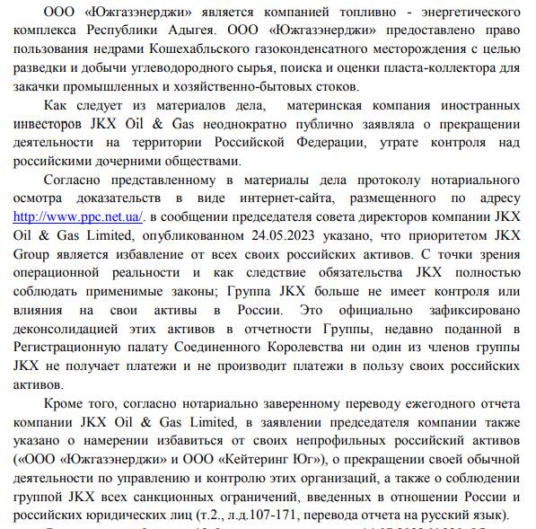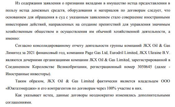 Как следует из материалов суда, компании Page Gas Ltd, Eurodril Limited, JKX Ukraine B.V. являются дочерними организациями компании JKX Oil & Gas Limited, зарегистрированной в Великобритании, то есть "Южгазэнерджи" контролирует именно JKX Oil & Gas Limited.