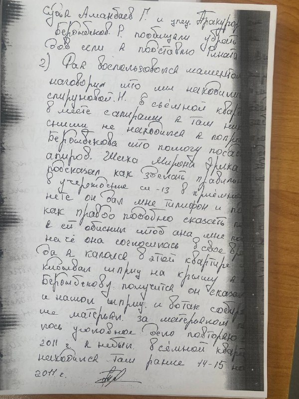 «В СИЗО, где я на тот момент находился, на меня сразу же начали оказывать психологическое давление Бердибеков Р. и прокурор. Они требовали, чтобы я придерживался первоначальных показаний, т.к. уголовное дело в отношении сотрудников полиции, которых я оговорил, может «развалиться». Во время длительных допросов, свыше 4-х часов без перерыва, без еды и воды, они говорили: «Ты куда лезешь?! Тебе будет п-ц!!! Мы натравим на тебя других заключенных! Мы расскажем другим заключенным, как ты подставляешь людей! Поедешь в лагерь, там мы тебе устроим проблемы!», постоянно унижали нецензурными словами. Заставляли присутствовать при избиении других заключенных. И в то же время обещали, если вернусь к первоначальным показаниям, которые я даже сам не писал, а просто подписывал уже готовые протоколы допросов, они мне уберут из обвинения некоторые эпизоды, в частности уберут нож как орудие преступления и тогда это будет уже не разбойное нападение. Также угрожали, что моему младшему брату (который младше меня на 10 лет) подкинут наркотики, если я не сделаю так как они хотят», – из обращения Е. Тизбаева.