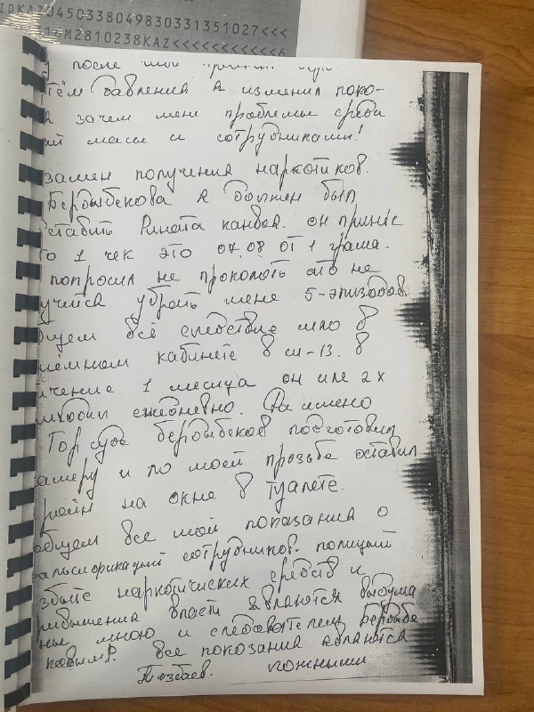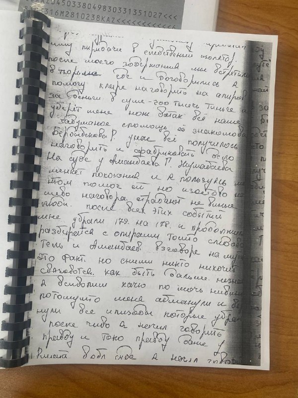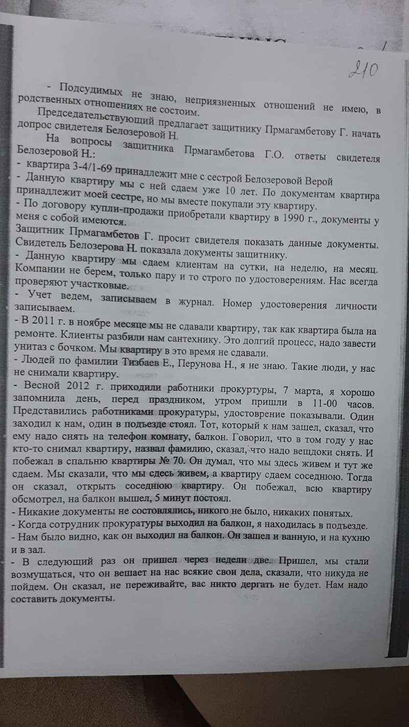 «С подачи Бердибекова надо было закончить это дело. Его зарегистрировали и это должно было быть правдоподобным. … Он мне занёс в тюрьму телефон с чипом, дал денег. На тот момент около 20 тыс. дал, по 2 тыс. давал, как ни придёт дело печатать. Постоянно принесёт… Проблем не было, сотрудники тоже таскали от его имени», – из видеообращения Е. Тизбаева