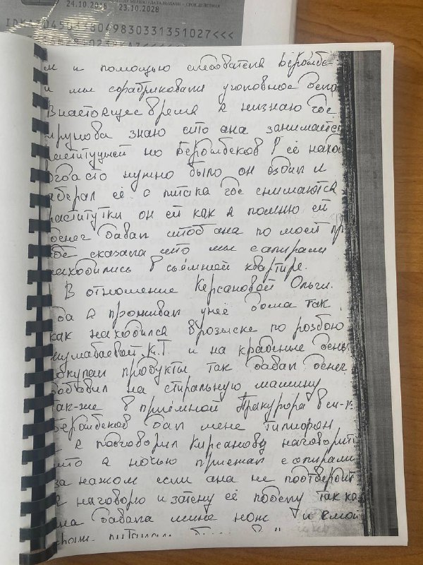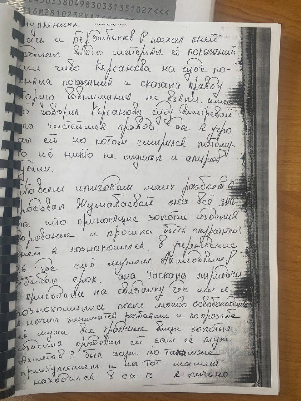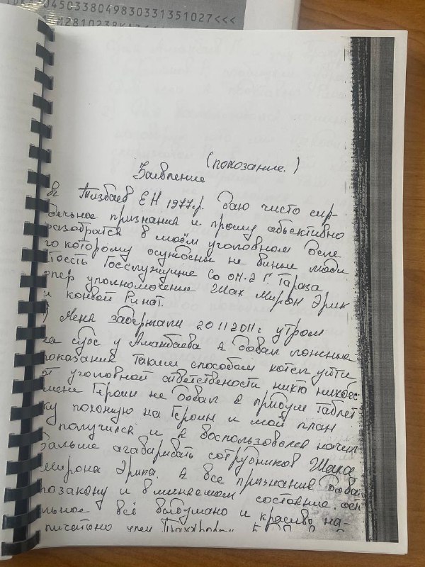 «В процессе следствия спецпрокурор по расследованию уголовных дел областной прокуратуры Жамбылской области Руслан Бердибеков (далее следователь) заставил меня оговорить сотрудников полиции, которые меня задерживали, типа они присвоили украденные мной деньги и заменили нож, как орудие преступления. А этот нож, которым я совершил разбой в отношении Жумабаевой Куралай, после моего задержания, сотрудники полиции сразу же изъяли у Кирсановой Ольги, у которой я ранее проживал», – из обращения Е. Тизбаева.