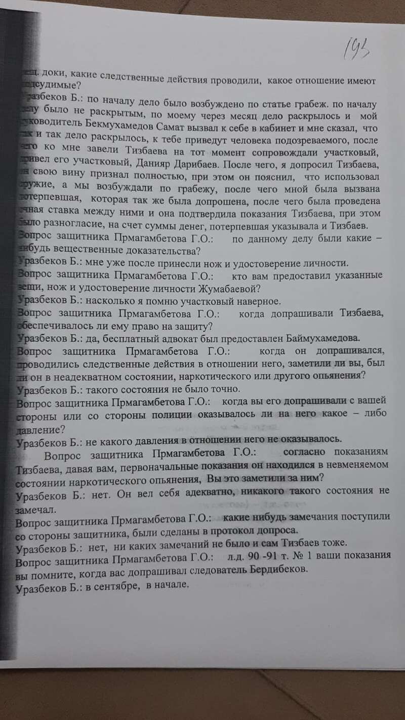 «Эти документы в уголовных делах. Там проводили опознание, и потерпевшие указывали на Тизбаева как на лицо, совершившее против них преступление. Потом в суде также подтвердили свои показания и по тем эпизодам Тизбаев признан виновным»,- поясняет адвокат Ардак Макамбетов.
