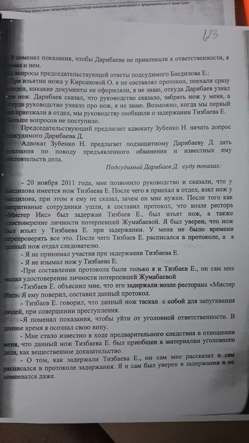 Тогда ввиду бюрократических требований в отделе полиции участковый Данияр Дарибаев записал обнаружение ножа при Тизбаеве, как тот и просил. Это посчитали акцентированным во вред Тизбаеву действием, о котором преступник якобы не знал.