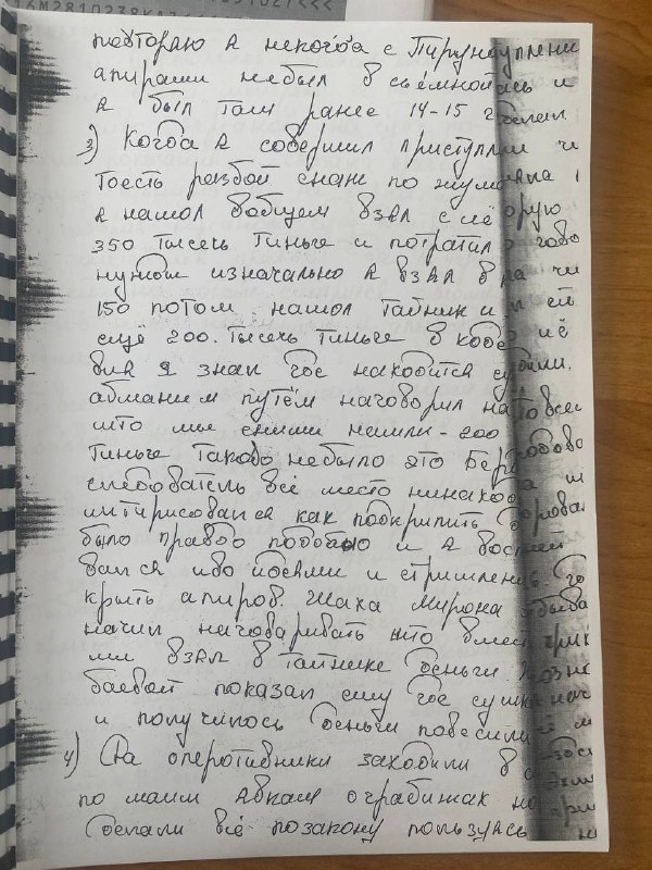 «22 октября 2011 г. я совершил разбойное нападение на гр. Жумабаеву К.Т. Я неоднократно сдавал ей золотые изделия с разбоев и грабежей. … Ножом, который был у меня во время нападения, я срезал петли на сумке и угрожая ей ножом отобрал эту сумку с деньгами. Сперва я нашёл 150 тысяч тенге, а потом, после звонка её мужа, из которого я узнал, что там ещё были деньги, ещё 200 тысяч тенге, в потайном карманчике. Деньги потратил на свои личные нужды и наркотики», – вспоминает Е. Тизбаев.
