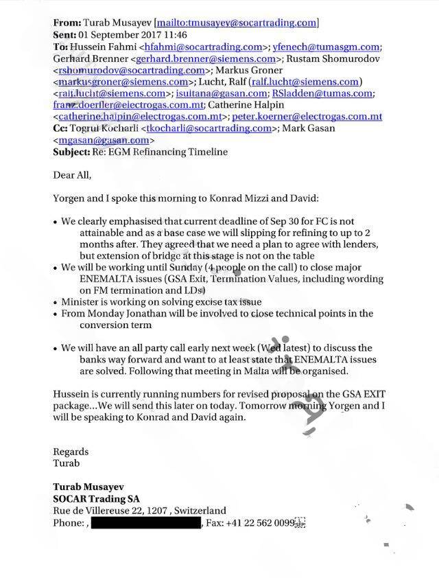 Интересы SOCAR в правлении Electrogas представляет азербайджанец Тураб Мусаев, он же — директор департаментов СПГ и развития бизнеса в самой SOCAR, он же — сотрудник ее швейцарской «дочки» — фирмы SOCAR Trading. По сведениям журналиста Times of Malta Айвэна Мартина, посредник убийства Дафны Галиции Теума рассказал, что незадолго до преступления Йорген Фенек встречался и долго разговаривал с «неким Турабом». Репортер не сомневается, что это был именно Тураб Мусаев и в качестве доказательства приводит в своем твиттере фрагмент электронной переписки, в которой Мусаев фактически координирует действия правительства Мальты по «решению проблем» государственной энергетической компании Enemalta. Характерно, что письмо начинается словами «Сегодня утром мы с Йоргеном <Фенеком> разговаривали с Конрадом Мицци…» — то есть, упомянуты сразу два подозреваемых в причастности к убийству журналистки. Ну, и конечно, нельзя не отметить тот факт, что гражданин Азербайджана, представляющий интересы SOCAR, на пару с местным бизнесменом решает судьбу «национального достояния» Мальты.