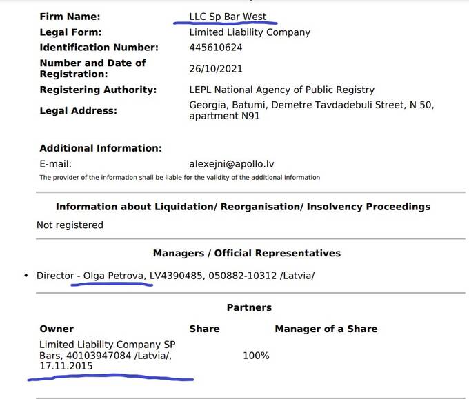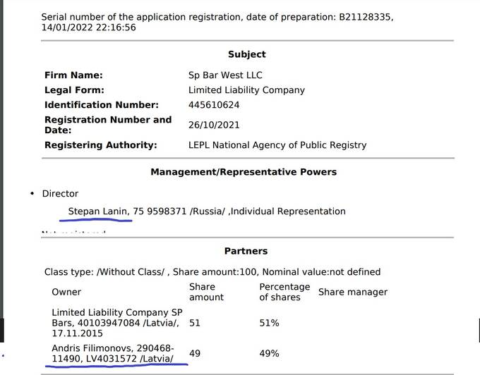 14 января 2022 года в ООО «Сп Бар Вест» (LLC Sp Bar West) появляется совладелец - Андрис Филимоновс с долей в 49% и директор Степан Ланин, причем последний значится как гражданин России: