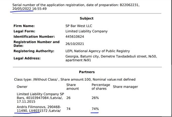 В мае 2022 года доли владения в ООО «Сп Бар Вест» (LLC Sp Bar West) изменяются: Андрис Филимоновс уже владеет долей в 74%