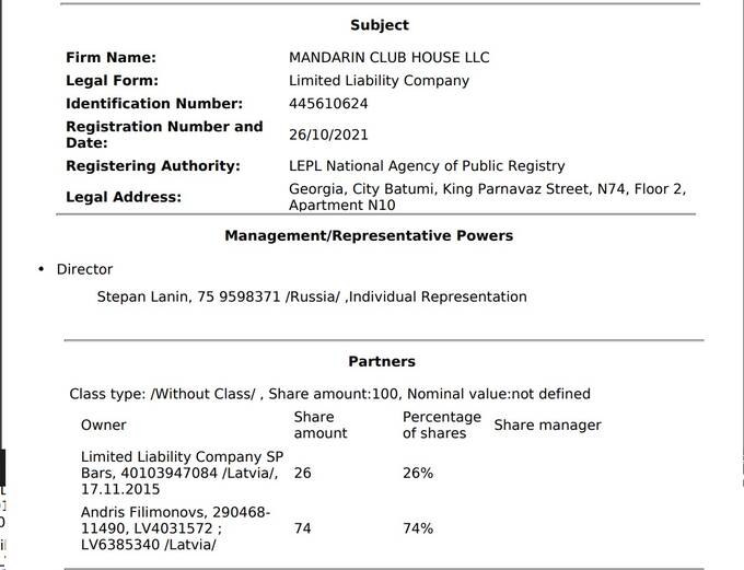Но, как гласят реестры, владельцы не менялись – по состоянию на август 2024 года владельцами ООО «Мандарин Клубный Дом» (Mandarin Club Housе LLC) все так же числятся ООО «Виком инвестмент» (VICOM INVESTMENT LLC) и Андрис Филимоновс.