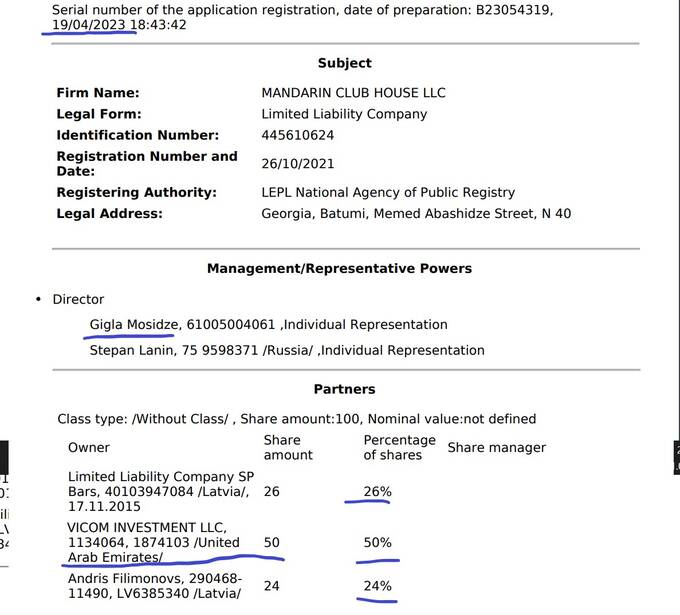 Что интересно – в момент открытия директором казино «Мандарин» был назначен гражданин Российской Федерации Степан Ланин, 06.05.1971 года рождения, паспорт 75 9598371, проживающий в Латвии, город Юрмала, улица Тиргониуса, 8-А. Но в октябре 2023 года его решили уволить, заменив на гражданина Грузии Гиглу Мосидзе (личный номер 61005004061, проживающий в городе Батуми, улица царя Фарнаваза, дом 108, кв. 89.
