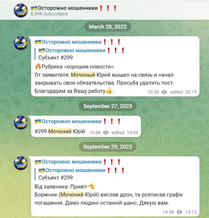 Но 28 марта 2023 года в Телеграм-канале «Осторожно - мошенники» была обнародована информация о том, что Мочоный мошенническим методом завладел денежными средствами в размере 750 тыс. грн. Через два часа эта публикация была удалена с подписью о том, что Мочоный вышел на связь с кредиторами и начал отдавать задолженность. Причем сообщений было два, с разными датами – 28 марта и 29 сентября 2023 года. Понять, идет ли речь об одном и том же факте или же Мочоный попался на двух разных мошеннических действиях, к сожалению, нельзя.