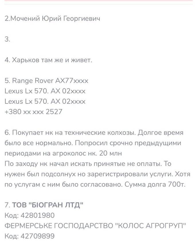 В архиве сохранилась публикация, которую просили убрать в связи с «выходом на связь» Юрия Мочоного. Из нее можно понять, что Юрий Мочоный обманул, судя по всему, ООО «Биогран ЛТД» и ФХ «Колос групп». Такие действительно существуют: первое зарегистрировано в Харькове, второе – в Кропивницком.