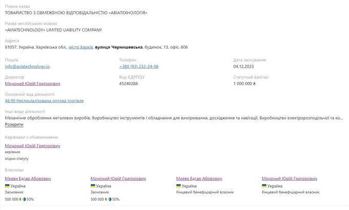 В декабре 2023 года Юрий Мочоный совместно с Эдгаром Мхеяном учредил ООО «Авиатехнология» с уставным капиталом в один миллион гривен.