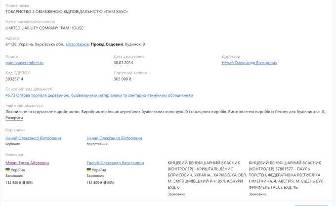 Кроме того, Эдгар Мхеян через ООО «Пам Хаус» связан с Денисом Кришталем, бывшим депутатом Харьковского областного совета от «Оппозиционного блока», перебежавшим в «Батькивщину». Еще один бенефициар ООО «Пам хаус» - гражданин Германии Пауль Торстен, проживающий в Австрии, г. Вена, ул. Фриммель Гассе, дом. 1б. Ранее Торстен был главой наблюдательного совета «Укрэксимбанка», однако в 2019 году НБУ не согласовал его назначение. Сейчас работает в Вене, его офис расположен в здании, где находятся офисы миллиардера Сергея Курченко, тоже одного из видных представителей «донецких». Также Торстена называют «хранителем бизнесов» экс-премьера Николая Азарова. ООО «Пам Хаус» фигурирует в ряде уголовных производств по хищение государственного имущества и подозревается в совершении других экономических преступлений.