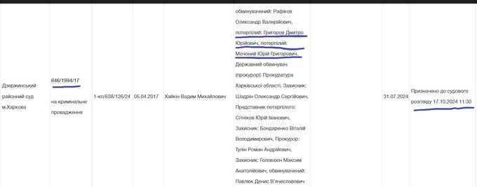 К тому же у Юрия Мочоного есть довольно неприятные факты в биографии, которые опять же свидетельствуют о его явно невысоком полете. Во-первых, он фигурирует в качестве потерпевшего в уголовном деле №42017220000000181, возбужденном 01.03.2017 года Дзержинским РОВД Харькова по статьям 186 («Грабеж») и 189 («Вымогательство») УК Украины. Дело до сих пор не рассмотрено по сути, но не закрыто – очередное судебное заседание назначено на 17 октября 2024 года, но это процессуальное заседание – о подсудности, а не по сути.
