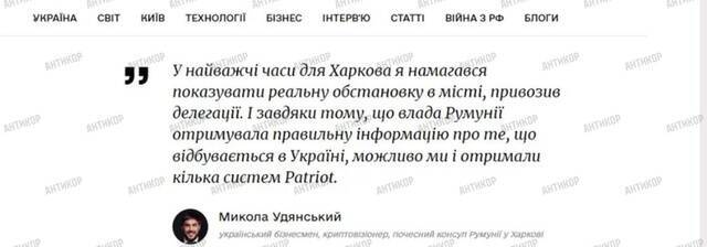 Но в связи с этим всем возникает вопрос – кто такой Николай Удянский, криптобизнесмен, как он представляется, и почетный консул Румынии, который невозбранно стреляет в людей из автомата (где он его взял, кстати?), и забирает у Румынии супердефицитные и супердорогие системы ПВО Patriot? Кстати, как гласит Википедия, он имеет даже государственные награды от Украины.