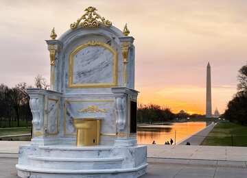 Возле Мемориала Линкольна в Вашингтоне установили гигантский золотой унитаз для Трампа, сообщает ArtNews. На табличке написано: «Трон, подходящий для короля»